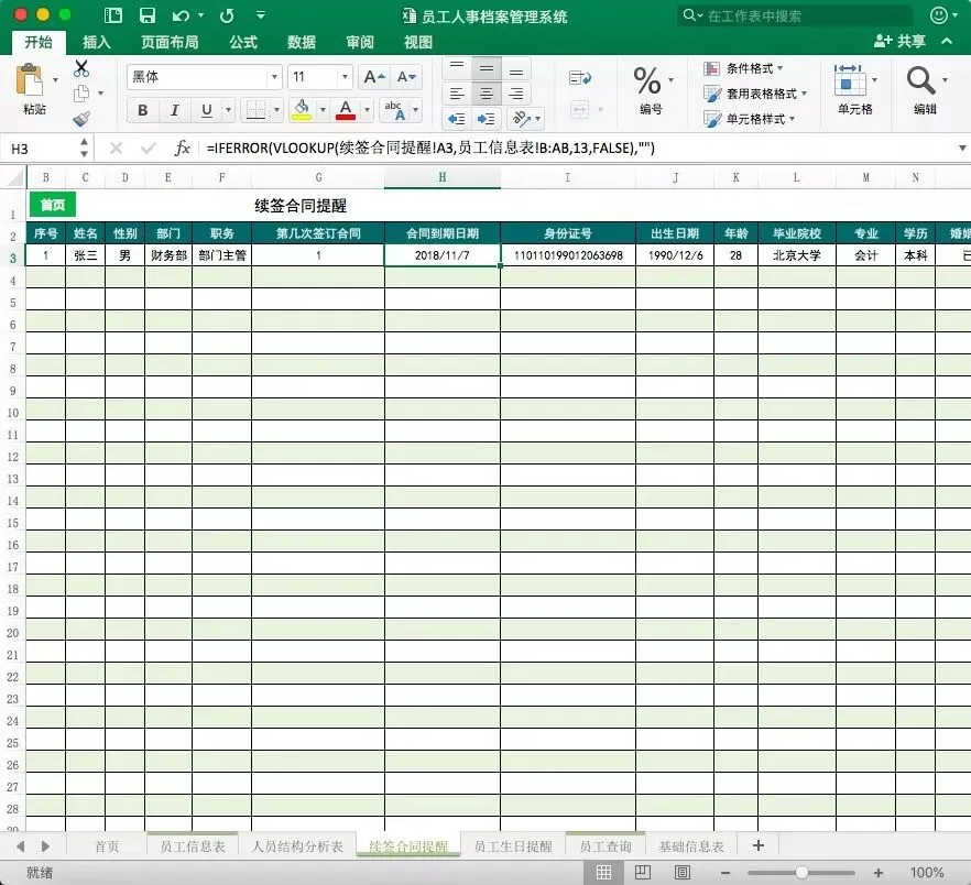 表格自带函数,对于需要续签的合同,会自动生成详情提醒。让HR绝不会因为合同忘记续签导致企业支付补偿金的情形。