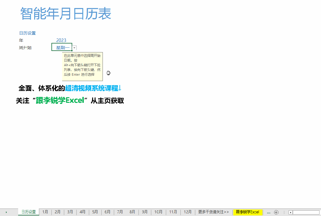 从下面的示意图动图演示中可以看到,当在日历设置表输入年份和周开始时,全年12个月份的日历都会自动显示。