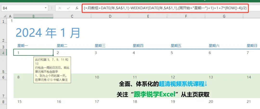 =月数组+DATE(年,$A$1,1)-WEEKDAY(DATE(年,$A$1,1),(周开始="星期一")+1)+1+7*(ROW()-4)/2