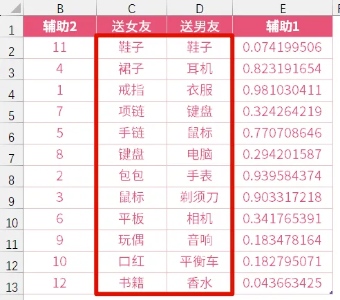 ❶ 打开【礼物配置表】这个工作表,将礼物填到对应的 C 或 D 列单元格中。