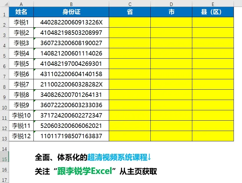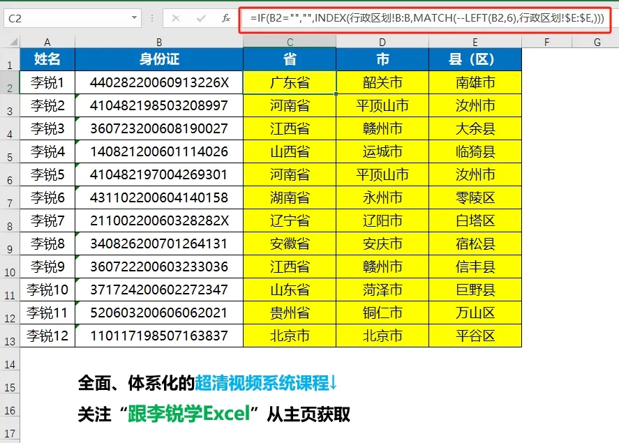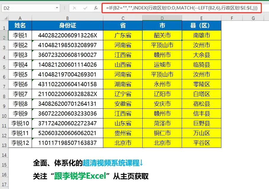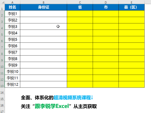 从下面的示意图动图演示中可以看到,当B列添加身份证信息的时候,后续几列自动查询出来对应的省、市、县(区),动图演示如下图所示。