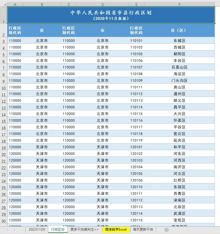 然后从国家官方网站下载一张行政区划代码表,这样才能用Excel公式根据身份证前六位的行政区划代码进行匹配,从中调取对应的信息;