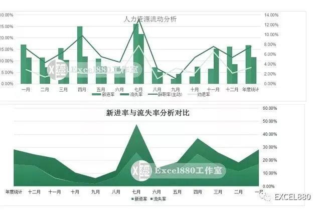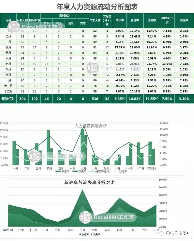 Excel模板 绿色年度人力资源流动分析表 新进率及流失率对比