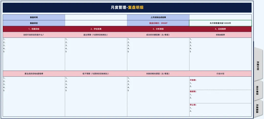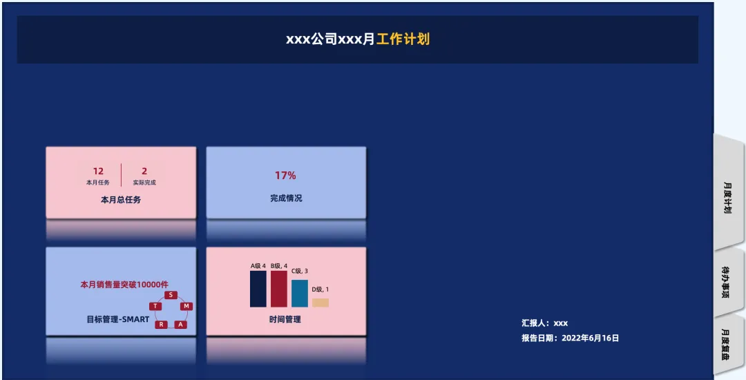 适用范围:月度计划、时间管理、待办事项管理、复盘管理模版包含:1-封面;2-月度计划;3-待办事项;4-复盘管理;5-SMART法则ps:此模版仅适用于xx月度计划与分析,不可用于多月计划统计与分析- 封面包含:本月总任务、完成情况、目标管理、时间管理等