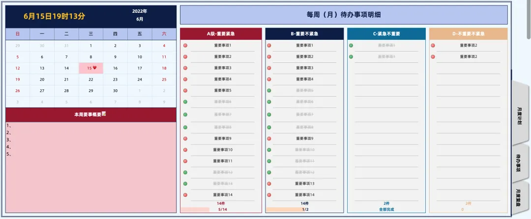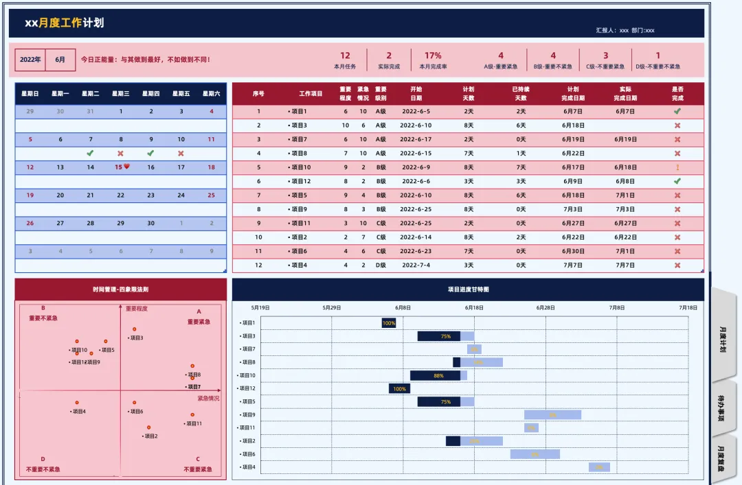 - 月度计划包含:正能量签、kpi导航区、万年历、本月工作计划、时间管理四象限图表、工作计划甘特图