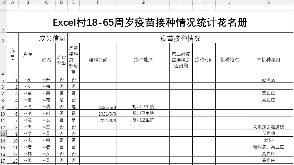再来看一下第2个《疫苗接种表格》模板,这也是一个花名册。