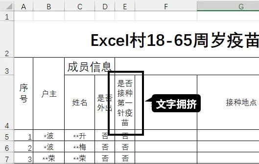 "是否接种 第一针疫苗"的表头文字太多,而填写的内容只有【是】或【否】,文字长度相差太大,所以在列宽上,顾此失彼。