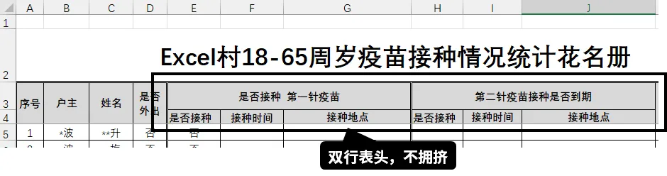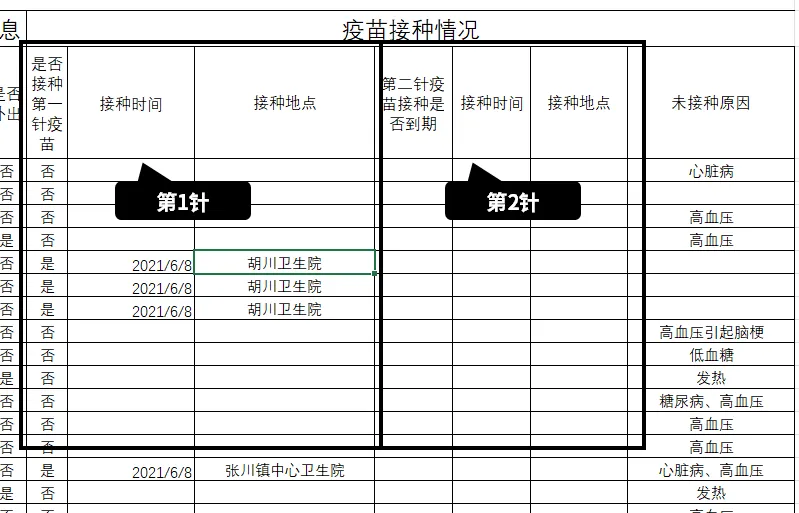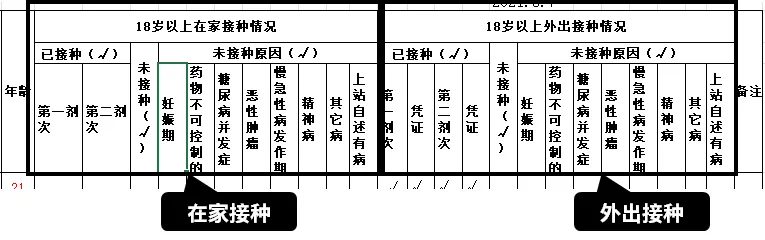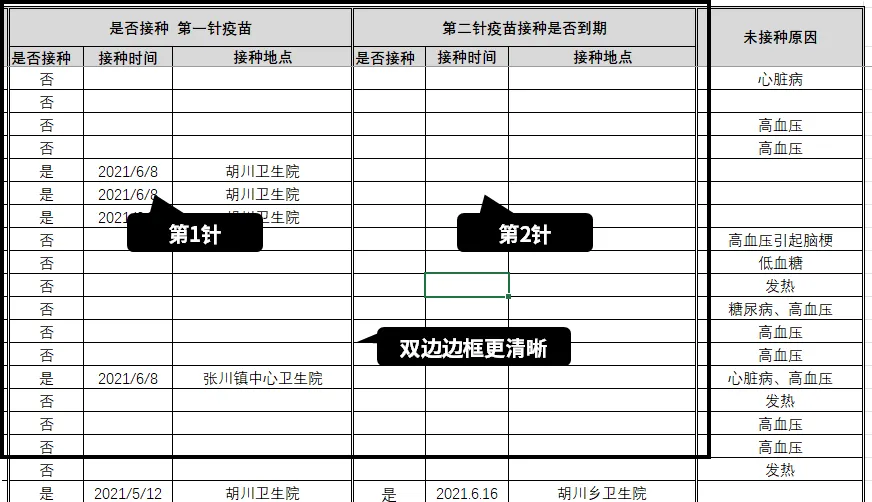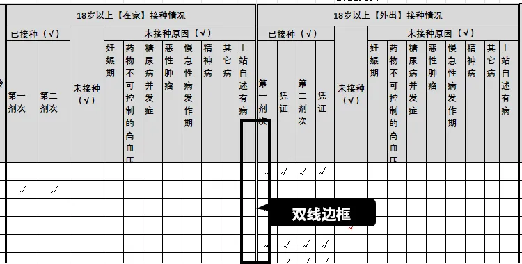 同时,表格中新增了“双线边框”,来区分【在家】和【外出】的接种数据列。