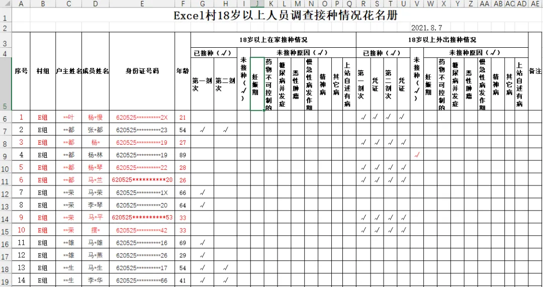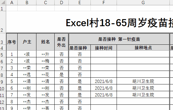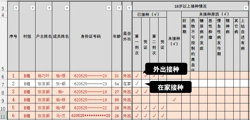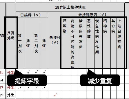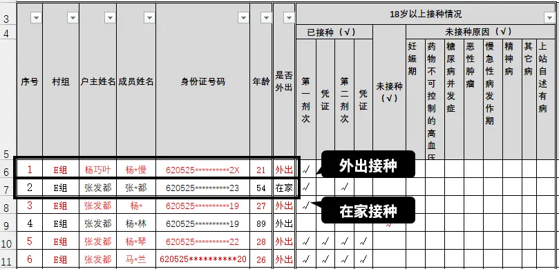 所以,我增加了一列【是否外出】,记录“是否外出”的状态,那些【未接种原因】就不用重复了,大大节省了空间。