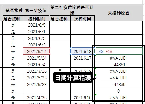 比如我们要计算两针接种时间差,检查是否>21天,这个日期格式相减,会是一个错误值。