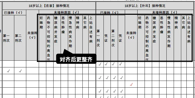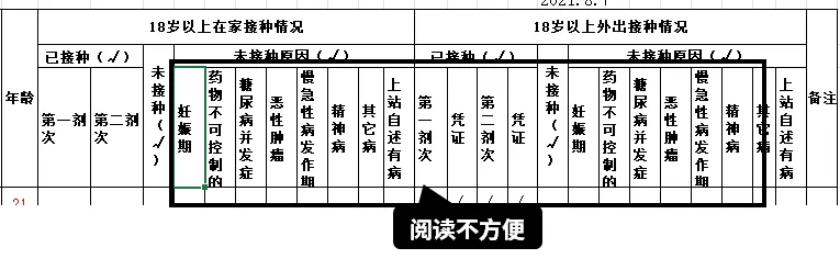 比如【未接种原因】列的表头,就重复并占用了很多的空间。
