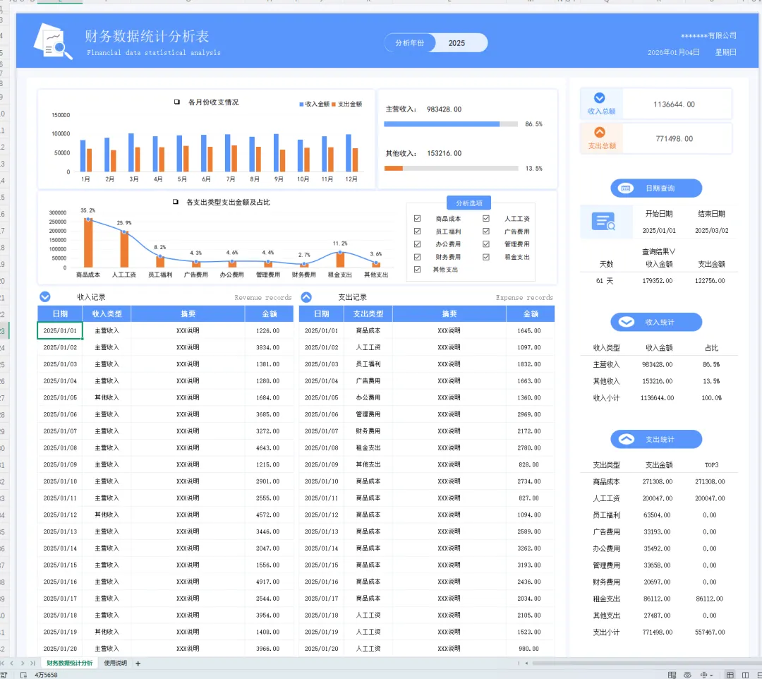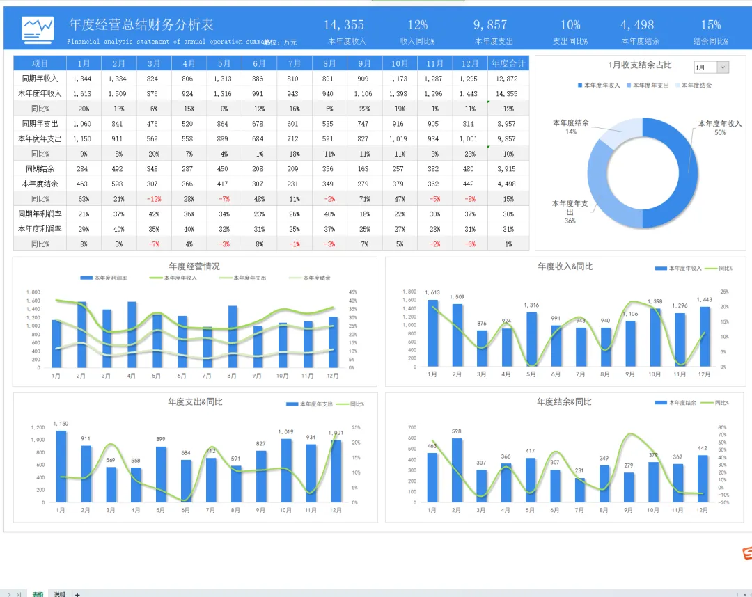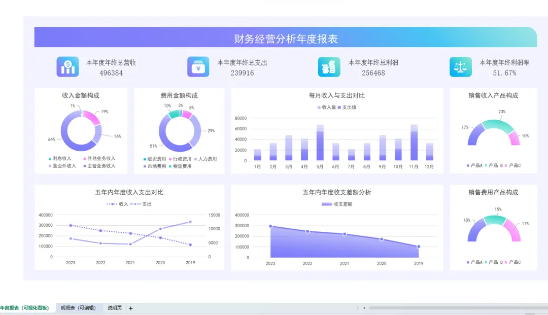 年度财务报表模板!含年度收入成本分析表模板、年度应收账款账龄分析表、年度收支明细表模板、年度经营数据分析表模板、年度费用预算表等
