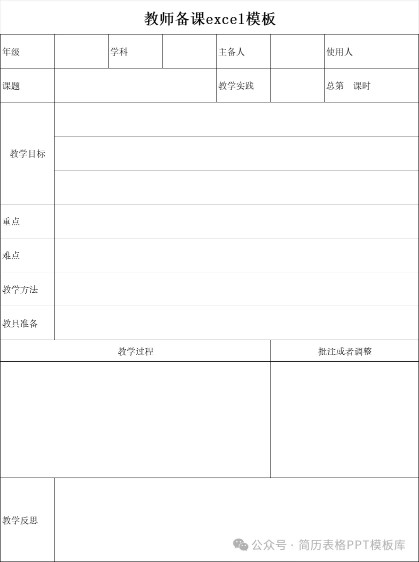 - 关键要素年级、学科、课题、课时、教学目标(知识 / 能力 / 素养)、重难点、教学方法、教具准备、教学过程、板书设计、课后反思。