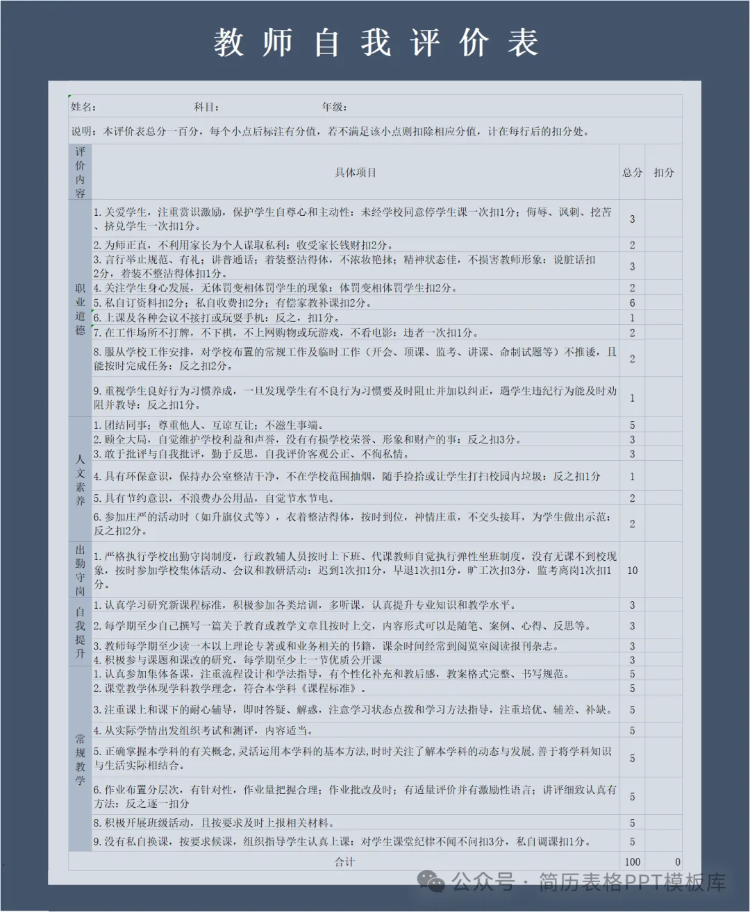 - 学生版:知识掌握程度、课堂表现、作业完成质量、自我提升计划。