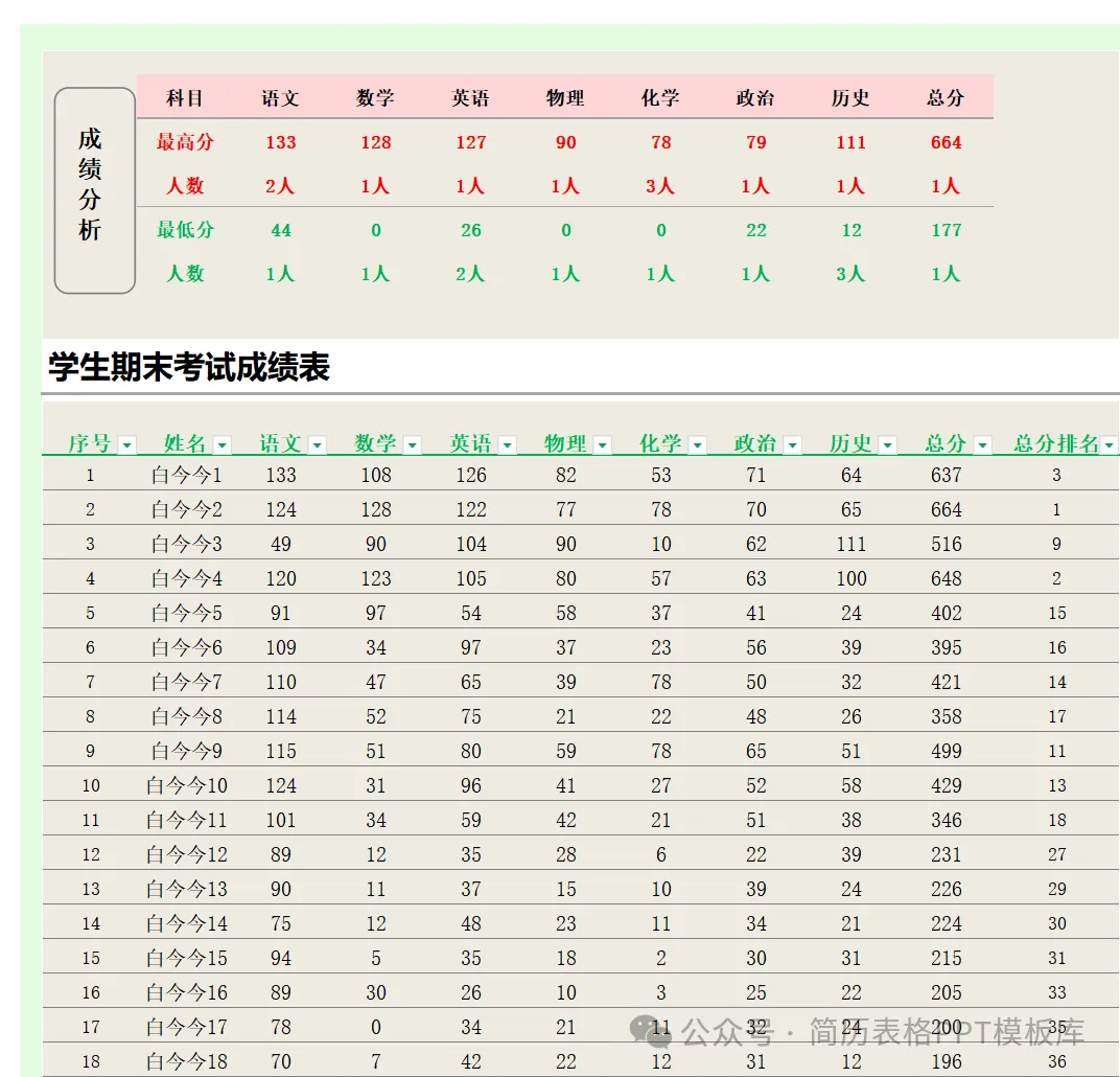 - 关键要素学生姓名、考号、各科分数、总分、班级排名、年级排名、平均分、及格率、优秀率、教师评语。