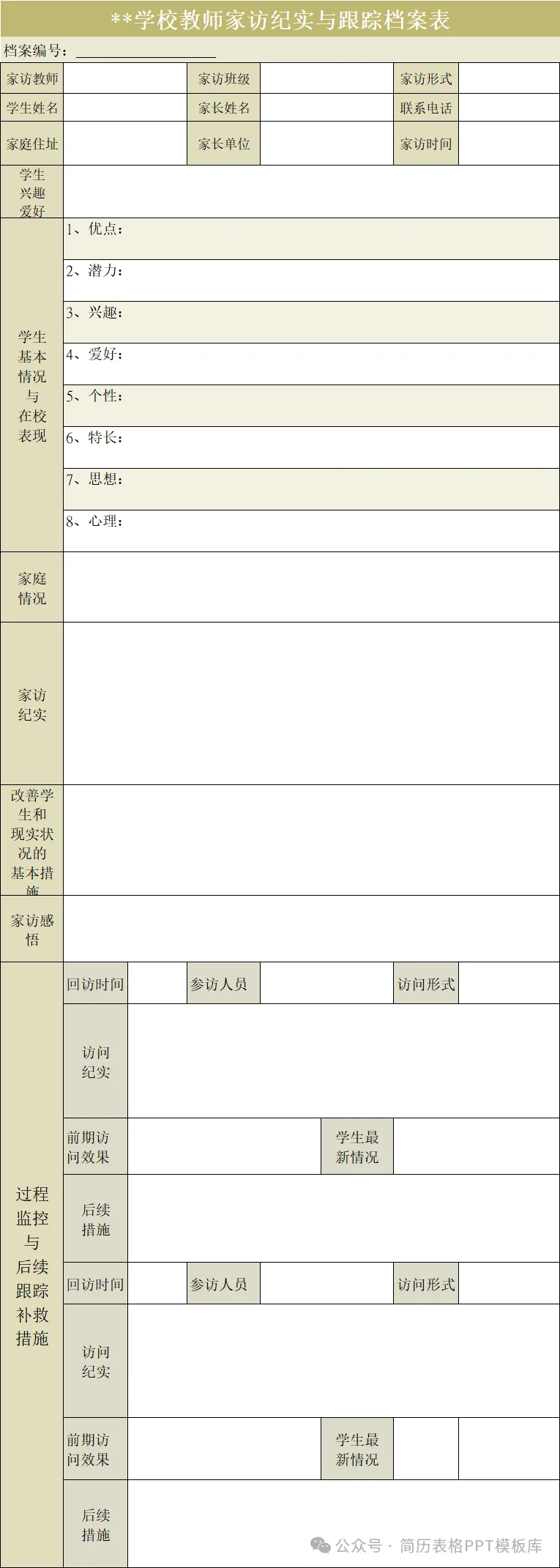- 关键要素学生基本信息(姓名、性别、出生日期)、家庭信息(家长姓名、联系方式、住址)、特殊情况(过敏史、慢性疾病、学习特点、家庭特殊背景)。
