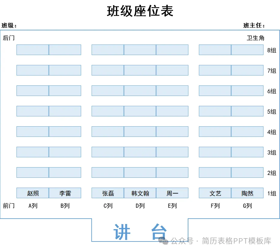- 关键要素班级、教室布局示意图、学生姓名、座位编号、特殊标注(如视力障碍、学困生、性格互补同桌)。