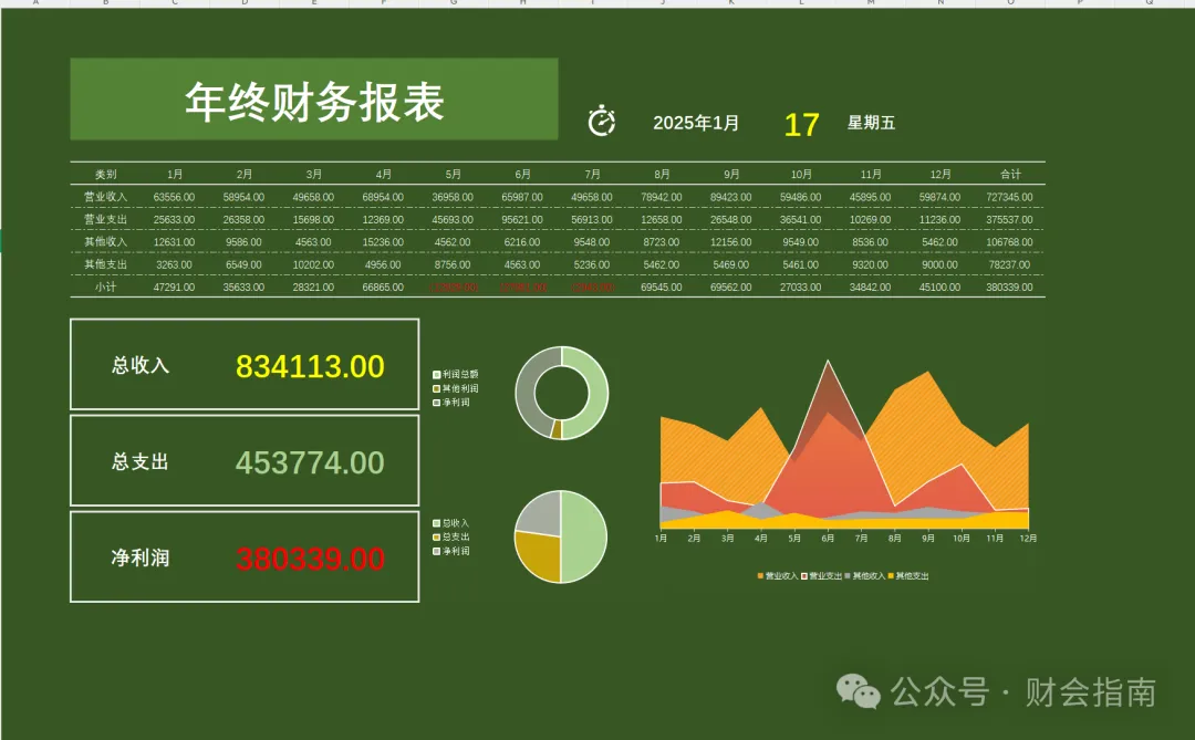 这不年底结束了,做2025年终财务报表分析没有思路的财务人员,今天可算是找到了,可视化年终财务报表分析模板(通用版),函数公式已设,套用自动生成可视化财务报表分析图形,省时省力!下面是具体的年终财务报表分析图形展示,可以看看。
