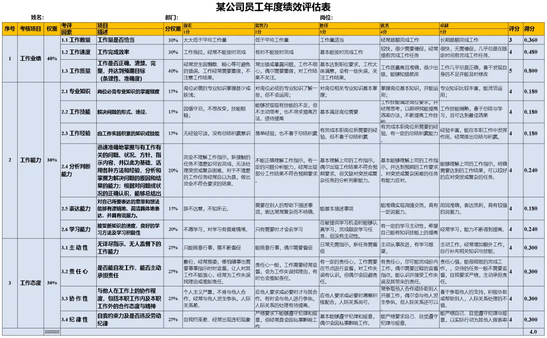 本资料为《某公司员工年度绩效评估表(Excel模板)》,欢迎加入会员领取!