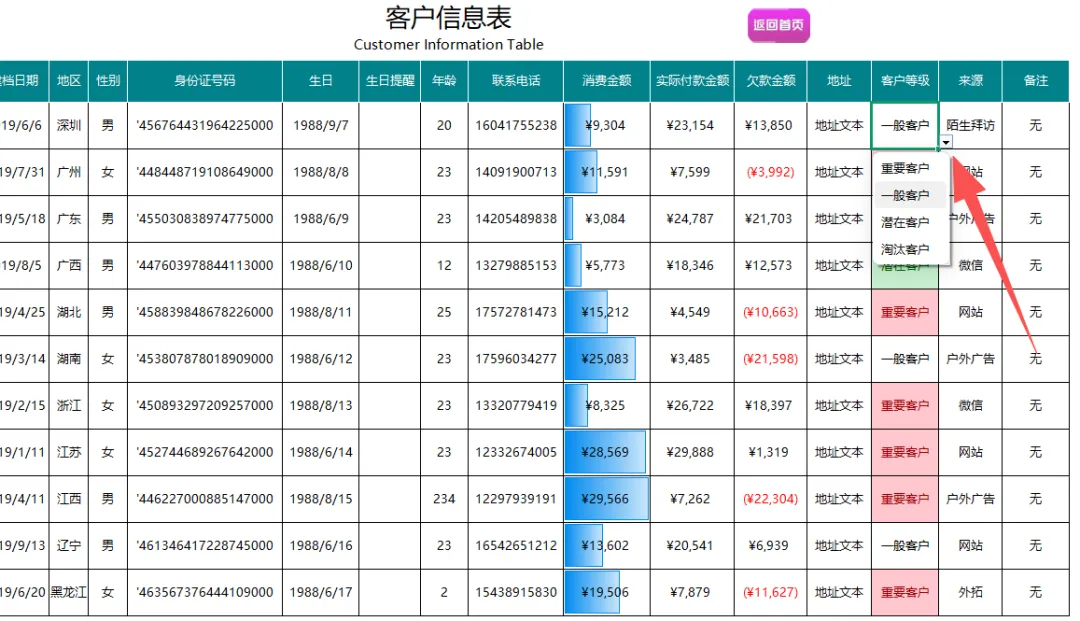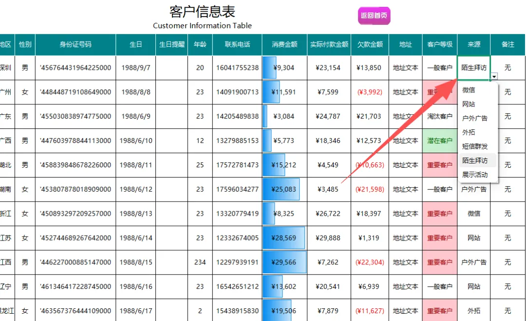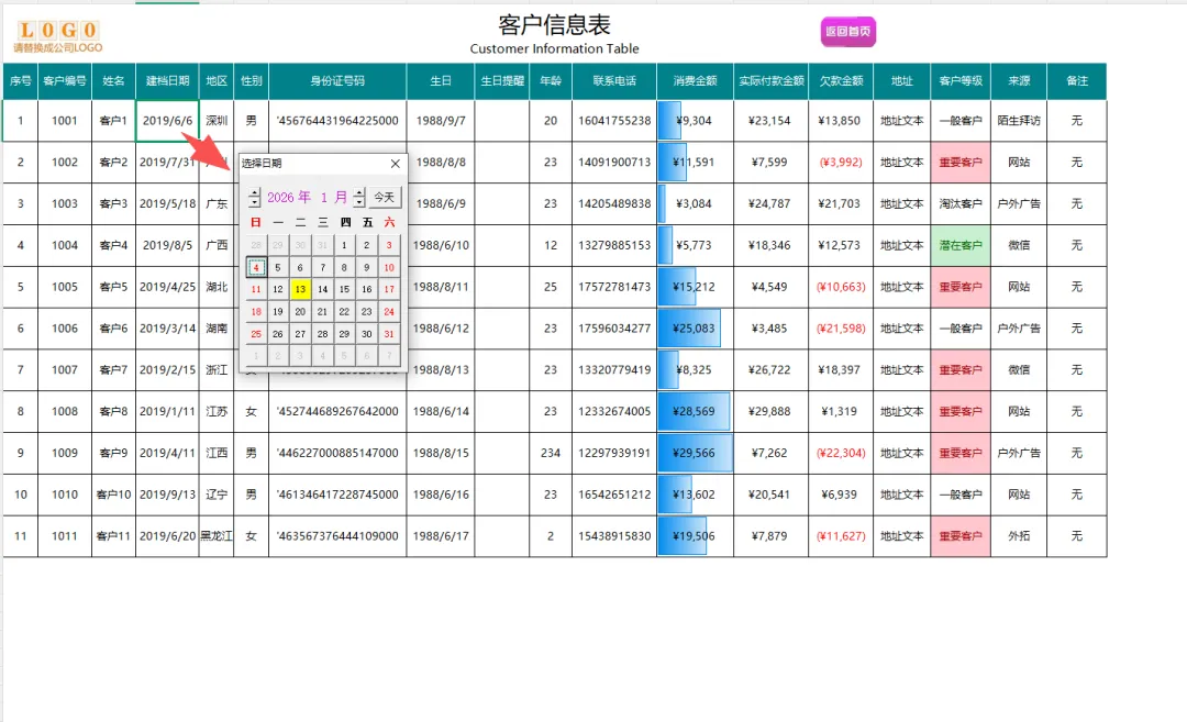 接着进行客户信息表录入。建档日期自带万年历控件,点选即可;生日提醒和欠款金额自动计算,客户等级和来源设有规范的下拉菜单,让信息录入既快又准。