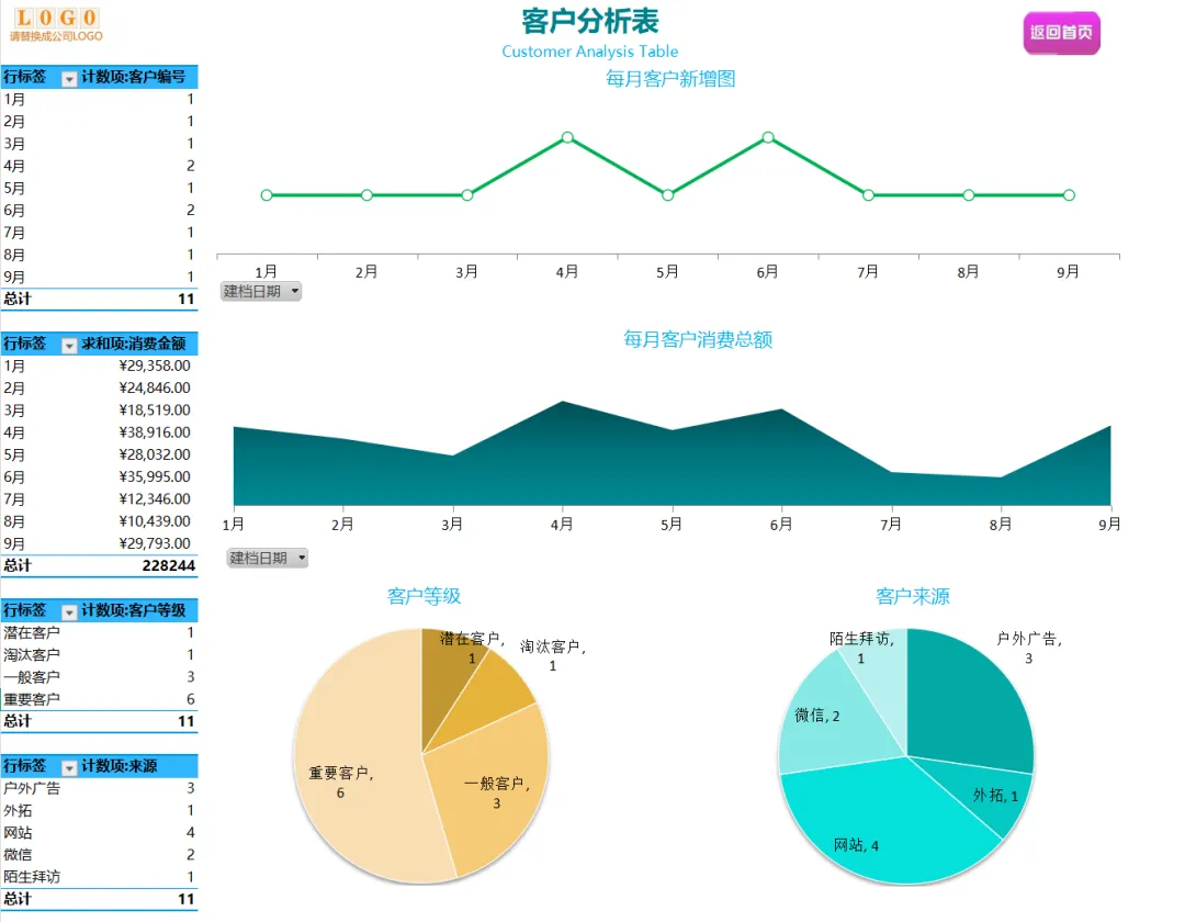 最后是动态数据看板。所有图表与数据实时关联,自动生成业绩趋势和客户占比图,帮你一眼洞察哪类客户最赚钱,让决策有据可依。