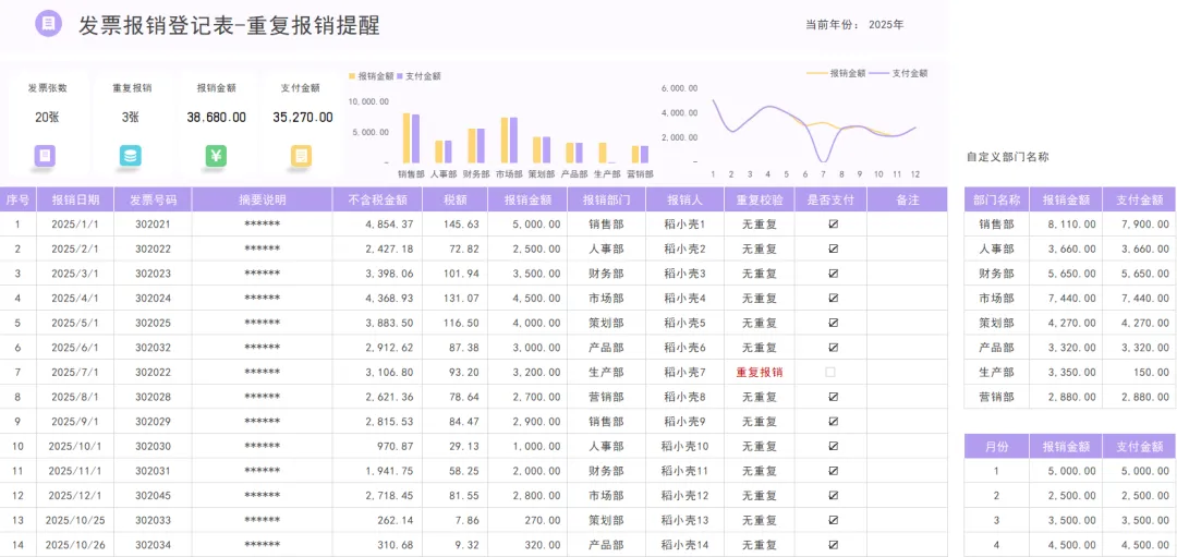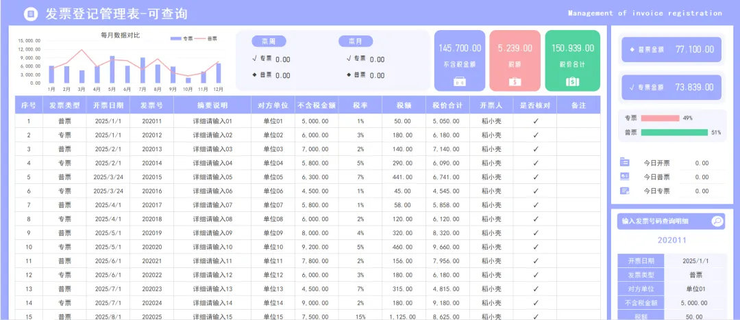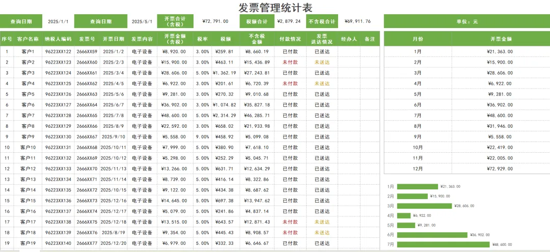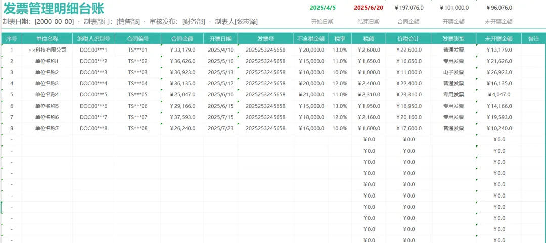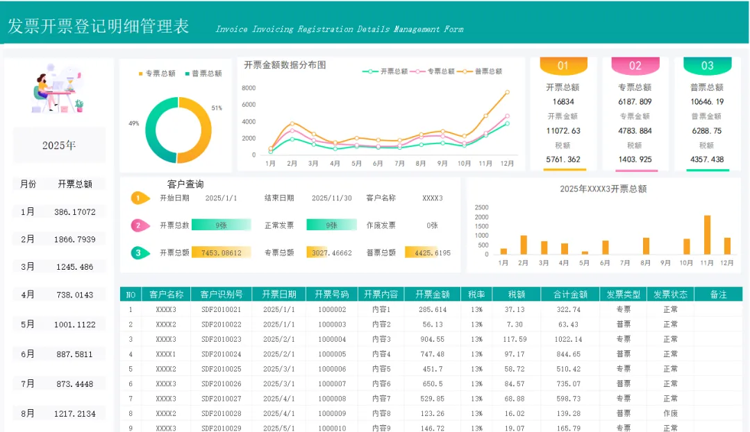 财务人必备!发票管理台账表格模板,公式已设置,带入数据自动统计