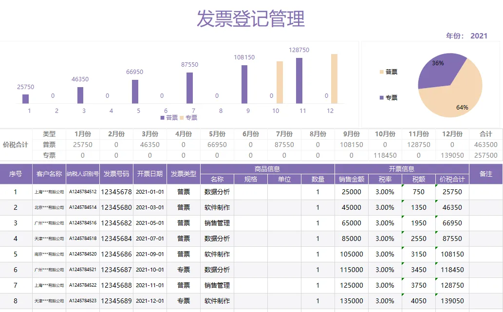 发票在日常企业经济业务过程中也是高频出现的,作为财务人员,发票也是一项考验性的工作,特别是日常的因为比较多的,发票自然而然的就很多。下面整理了一些发票台账模板,公式已设置,带入数据自动统计,数据一目了然。让我们往下看看吧!(文末有资料领取的方法)
