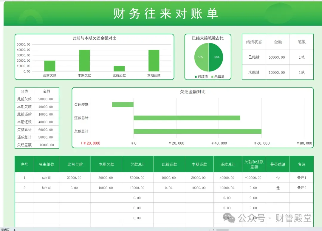 月底对账,会计人员都觉得太繁琐了,一对就能耗上好几天,连口水都不敢喝。其实,对账最主要的就是各类账目明细清晰,这样月底对账就轻松多了。今天带来了:会计月底对账单模板。其中包含考虑对账单表格模板、应收应付往来款对账管理系统!月底进行往来款对账或者是供应商明细对账,都可以直接套用此模板,设置了函数公式,一键套用即可,操作简单。