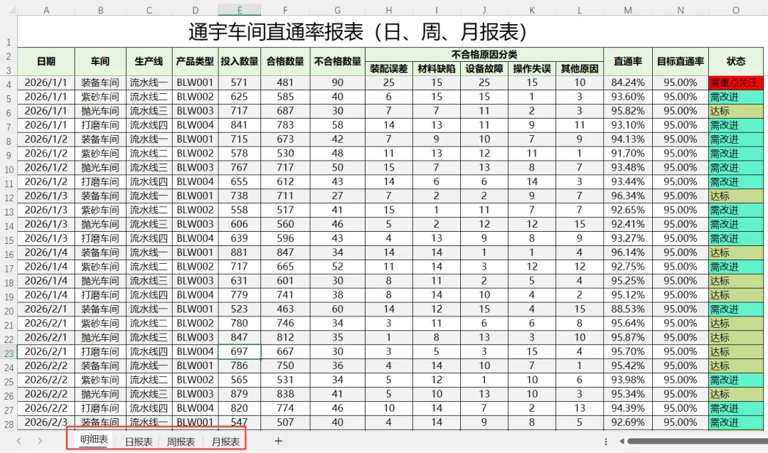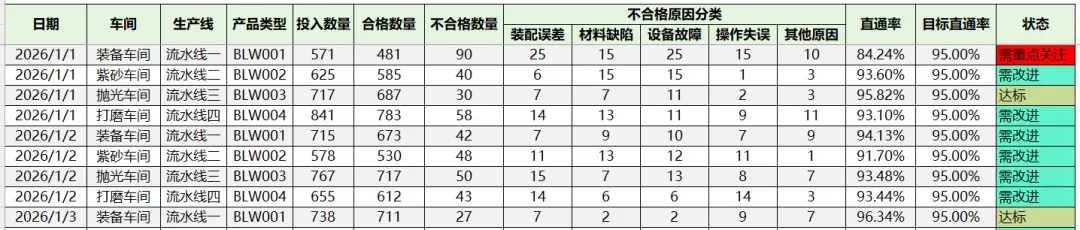✅ 全自动计算:直通率、合格数、不合格数、分类统计全部公式化