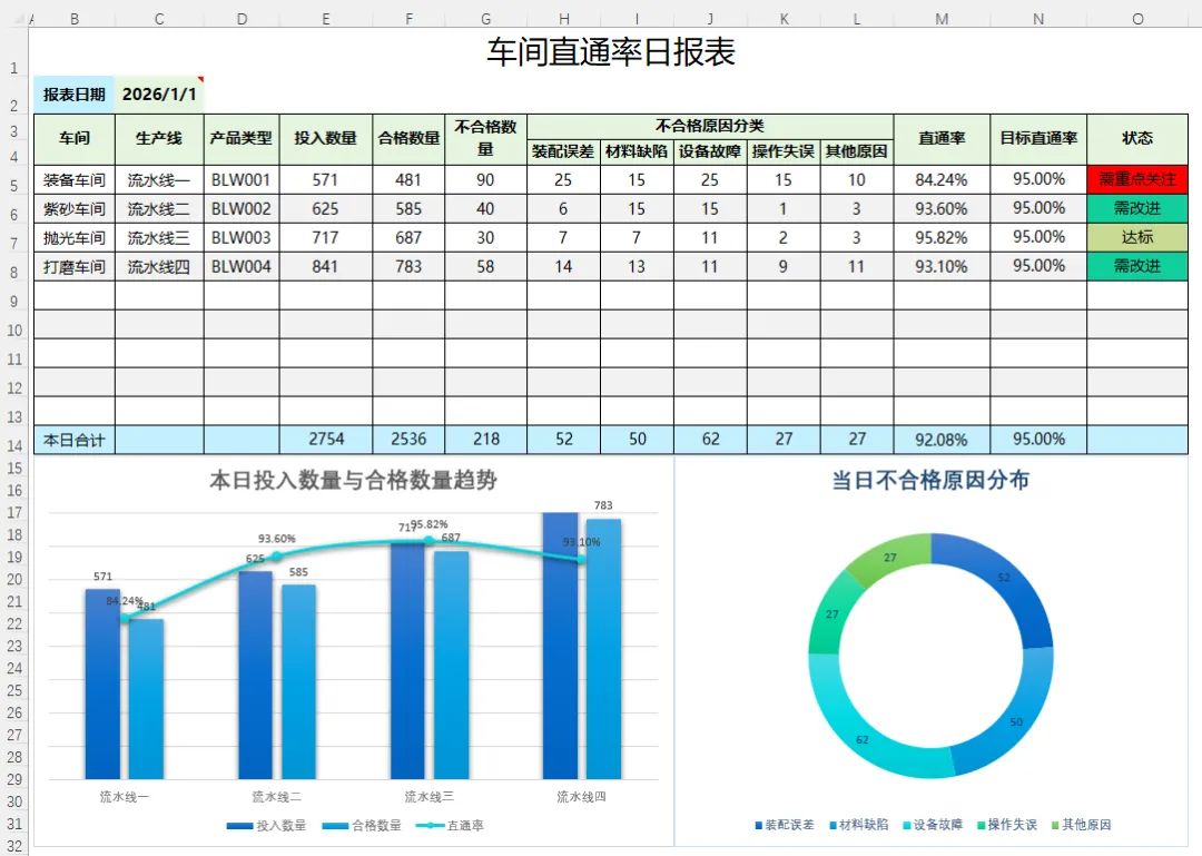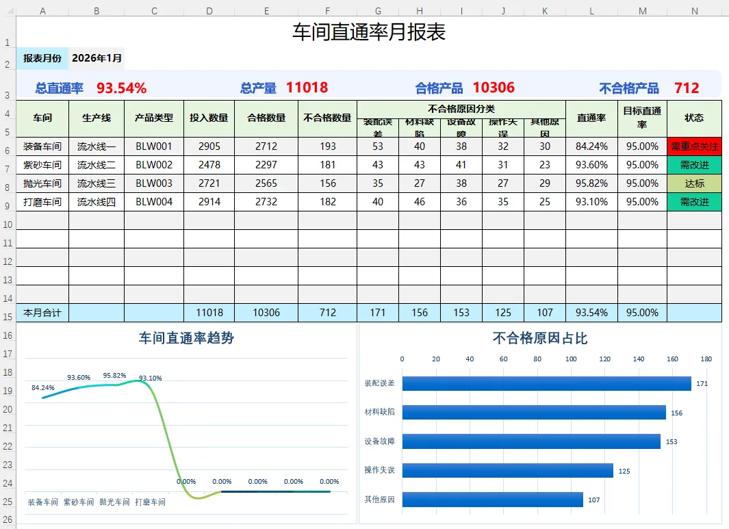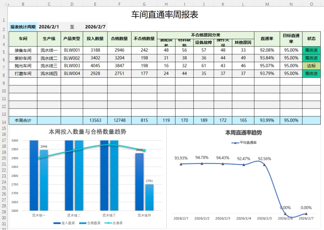 用好数据,才能管好生产。这套 Excel车间直通率报表模板,不仅是一张表,更是一套轻量级生产管理系统。