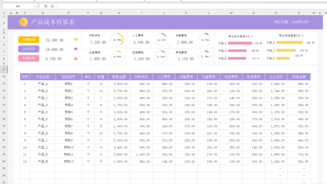3、成本核算表全公式自动计算。