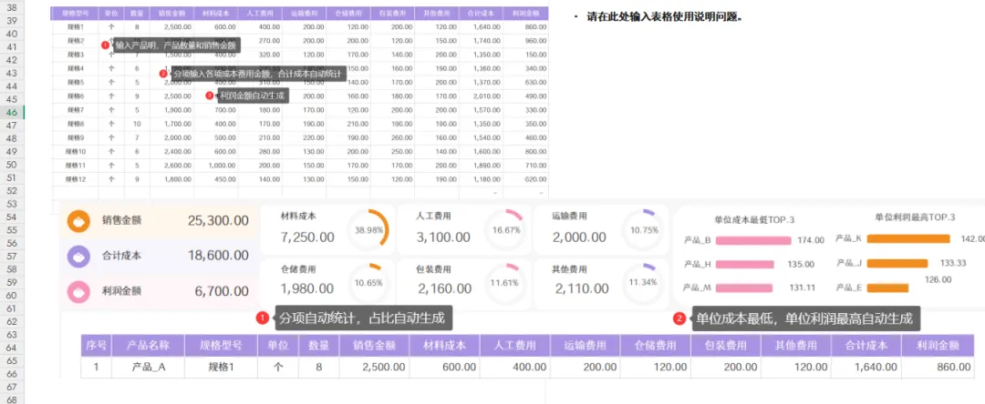 2、单位成本和单位利润自动计算。