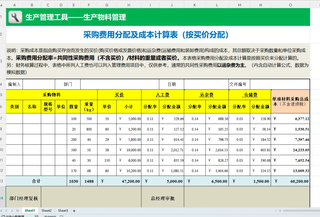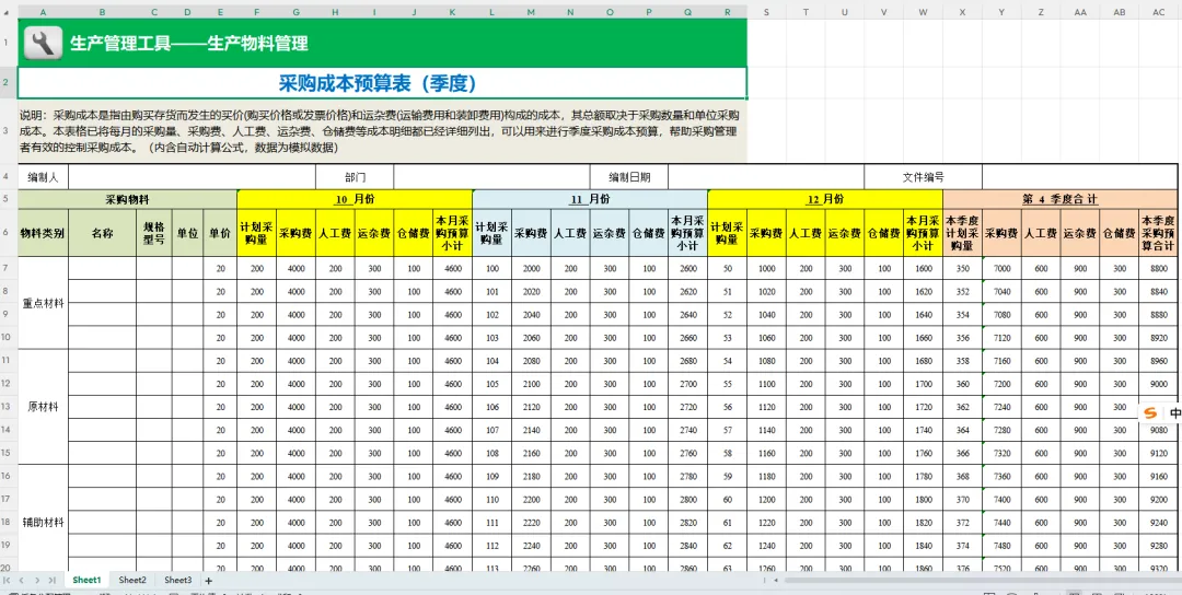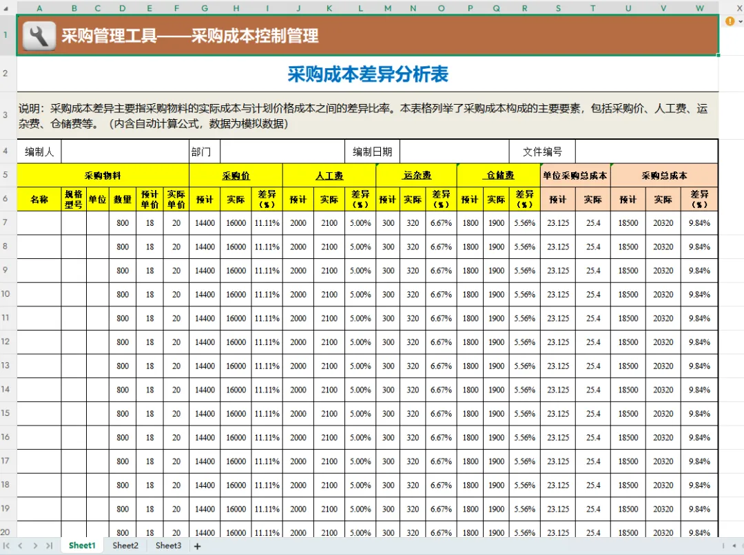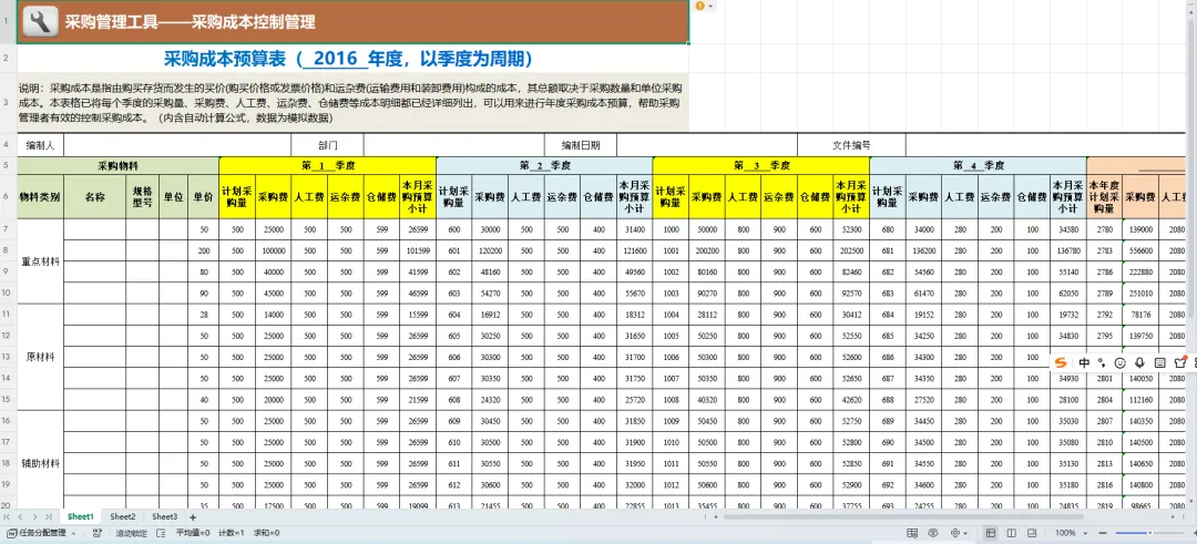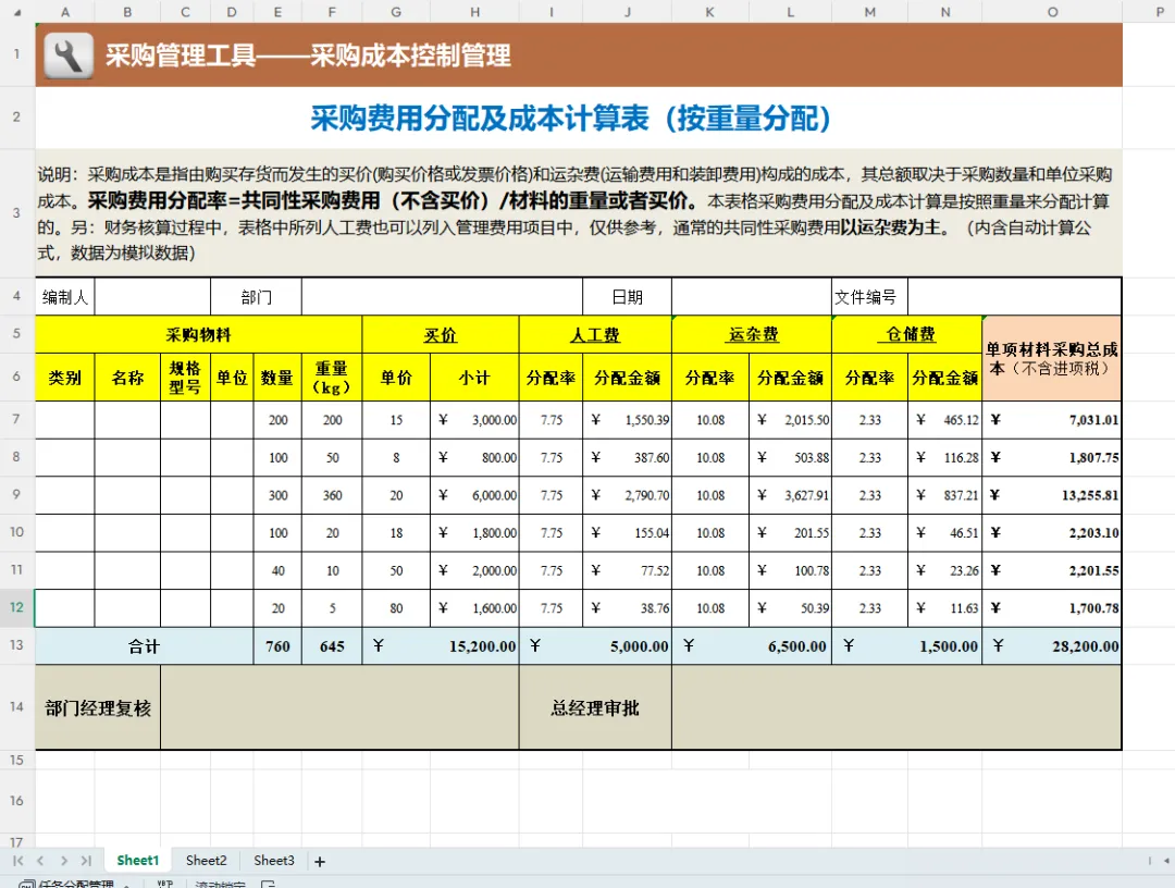 采购成本核算报表:采购成本预算表模板,带公式,套用自动生成采购成本分析表