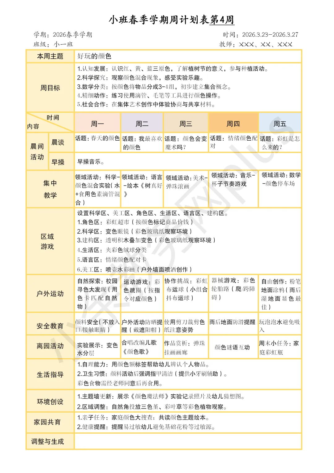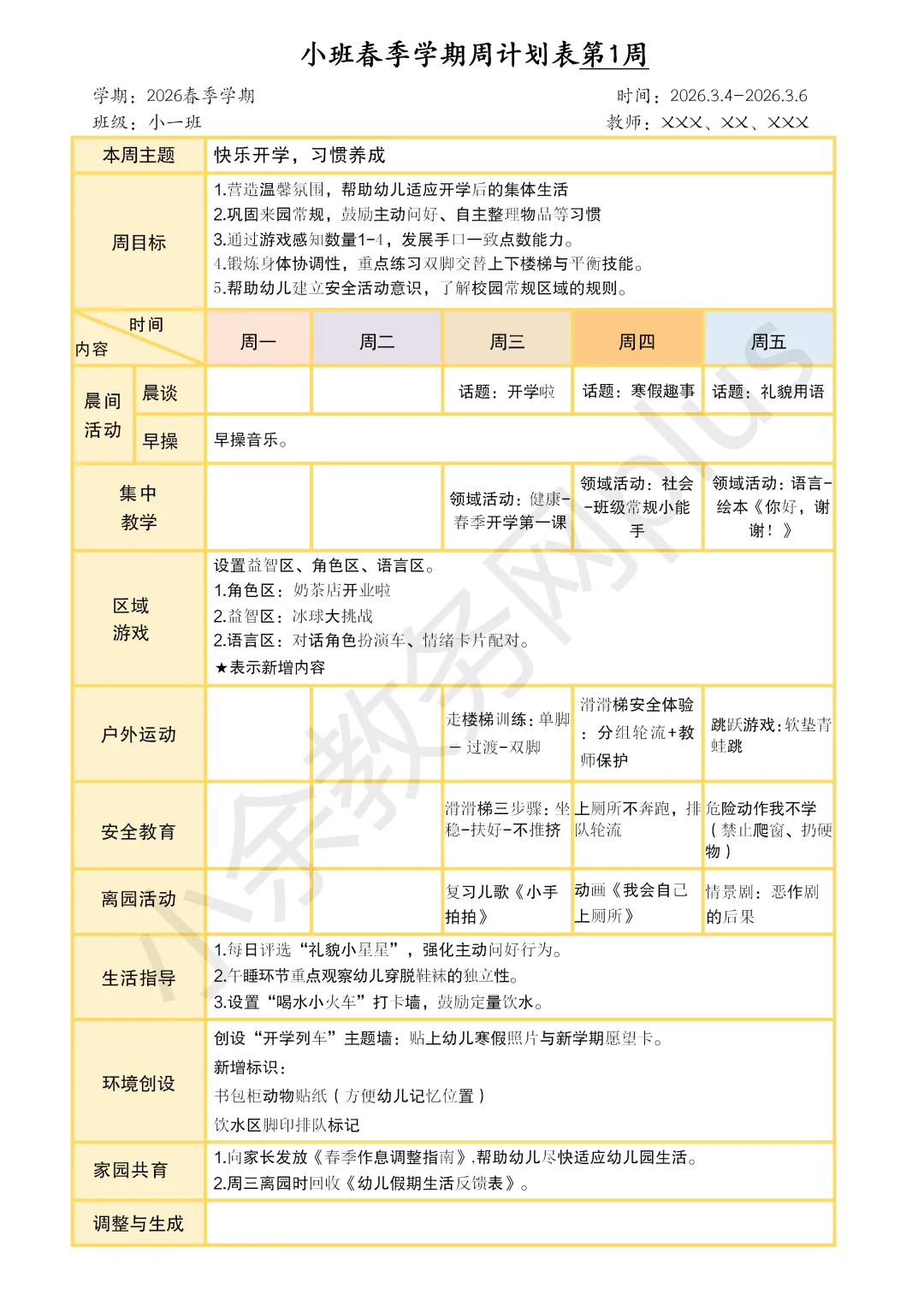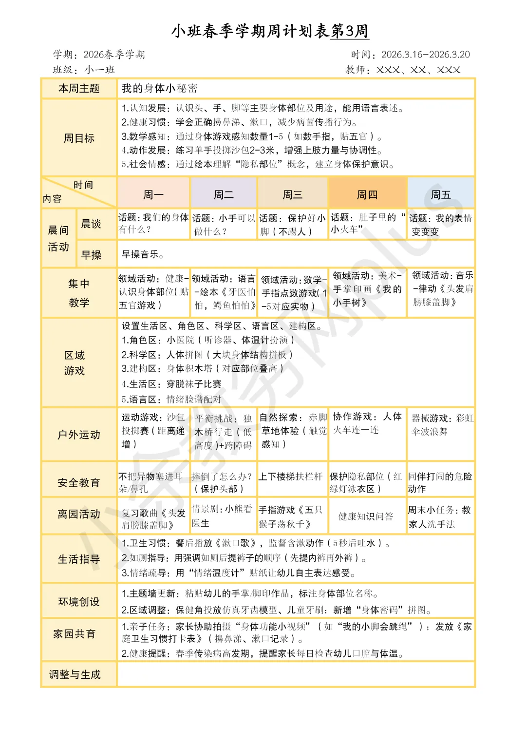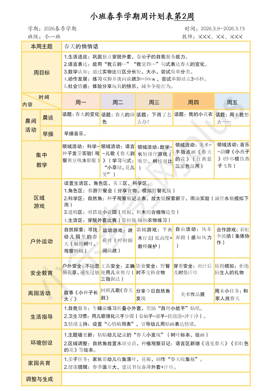 幼儿园小班春季学期周计划表格模板(Word 格式版)。