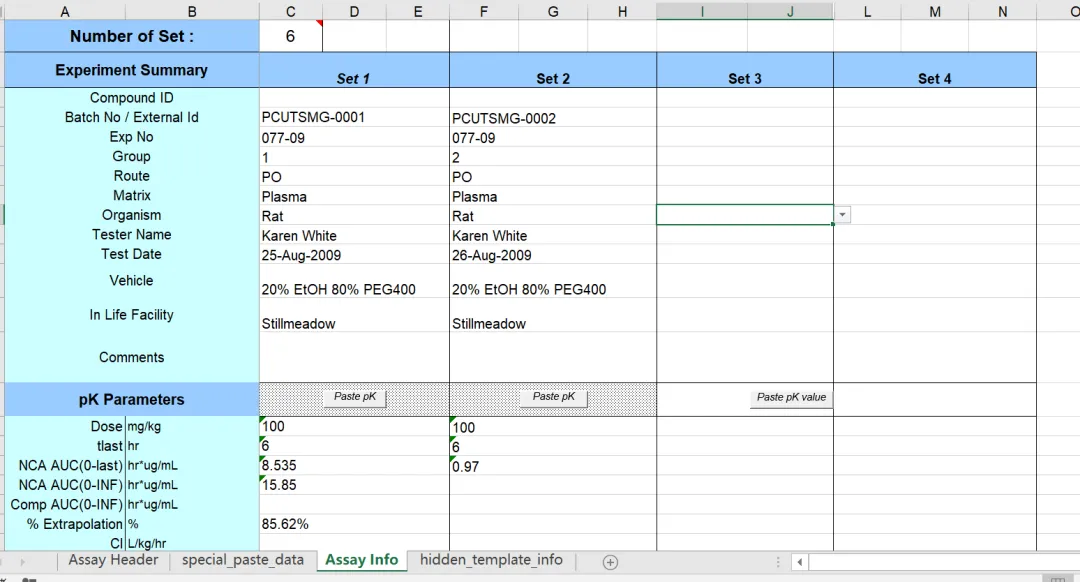 事实上,我们也听到很多实验室的研发人员会说一个固定的行列的计算模板无法兼顾多变的实验条件,例如DMPK中不同的动物数量,多变的给药周期和剂量组数,CMC中的可能产生不同数目的杂质。例如如果某个模板为满足8只动物去设计的,但某次实验用到的却是10只动物,通常的做法是去增加2行或2列,同时去增加相应的公式。这种做法上文已经提到是不合适的。那么是否需要做一系列的模板,分别满足所有可能的动物数量呢,这样做恐怕会有天量的验证工作需要做,模板的管理也会变得十分复杂。这里给出一种推荐的办法。就是在模板设计时按照最大量设计,即最多会用到多少只动物,那么就以该动物数量设计模板,并且以最大量使用时的数据状况进行验证。此处会有人说会存在大量冗余的列或者行,影响排版和使用。那么关键点来了,我们知道Excel中有一种不改变内在只改变表观的操作:“隐藏”。在每次使用时根据实际需要隐藏不需要的列或行,这样就不会改变模板的结构,又满足了模板的通用性设计。如果想要免除人工进行隐藏的麻烦,可以嵌入宏根据用户输入的变量进行自动隐藏。