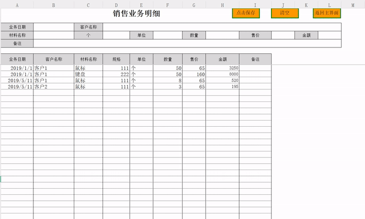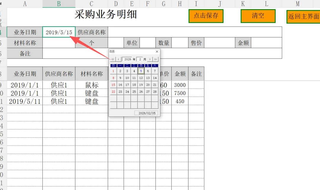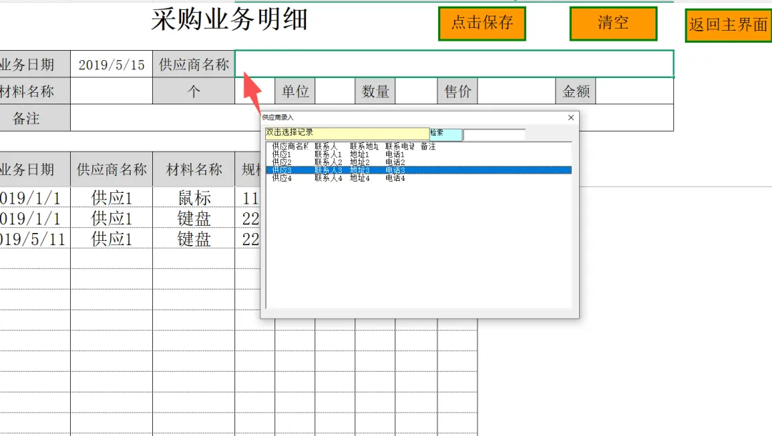 2. 购销记录:在【采购记录】与【销售记录】中,您可以通过双击日期、供应商、客户及商品单元格,在弹窗中选录信息,其余单元格内容手动填写。