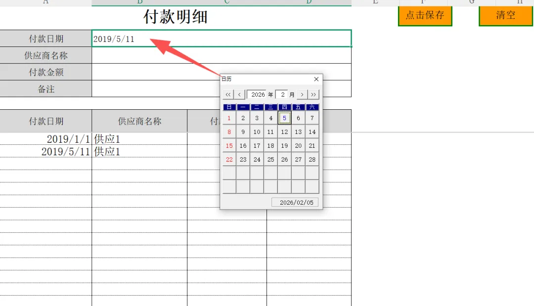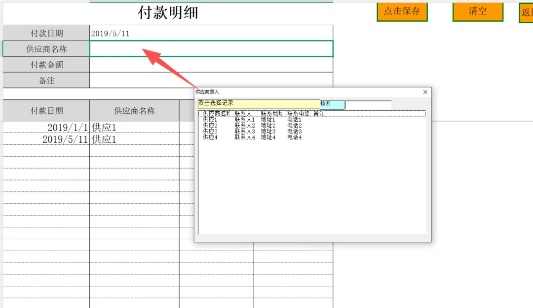 3. 收付款管理:当发生资金往来时,请在【付款单】和【收款单】中进行登记。日期,供应商、客户同样支持双击弹窗选录信息。