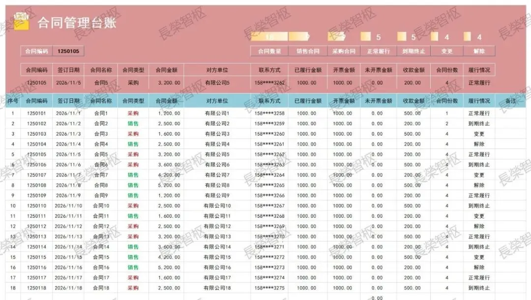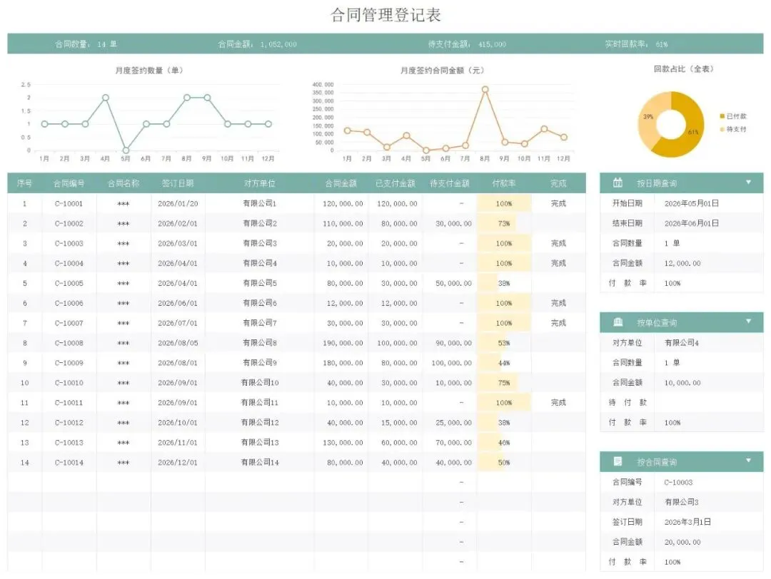 合同管理的繁琐?台账登记杂乱、应收付款核对耗时、支付明细无从追溯,不仅浪费时间,还容易出错,影响工作效率!今天给大家整理合同管理系统可编辑模板,一站式覆盖合同管理核心需求,无需手动搭建,下载就能编辑,彻底提高效率~