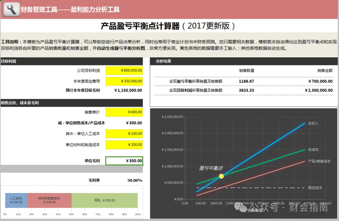 下面是给各位财务人员带来了常用的盈亏平衡分析模板与盈亏平衡点自动计算器,财务一键套用,省时省力,具体操作见下文。