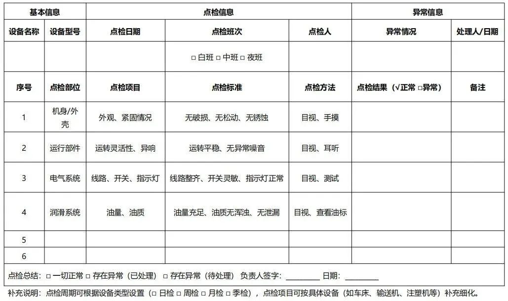 为此,我们整理了3份可直接复制使用的设备管理核心模板,涵盖《设备点检表》《设备维修记录表》《备件管理台账》,适配各类生产型企业、车间,无需复杂修改,可直接打印填写,完美解决日常设备管理中的表单难题,助力高效规范完成设备管控工作。