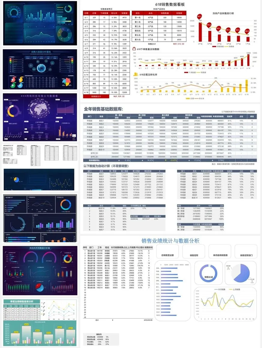 专业数据分析模板合集,覆盖销售财务多场景需求。这套模板包含丰富的图表类型,从基础柱状图到复杂的数据看板,满足不同层级的数据展示需求。