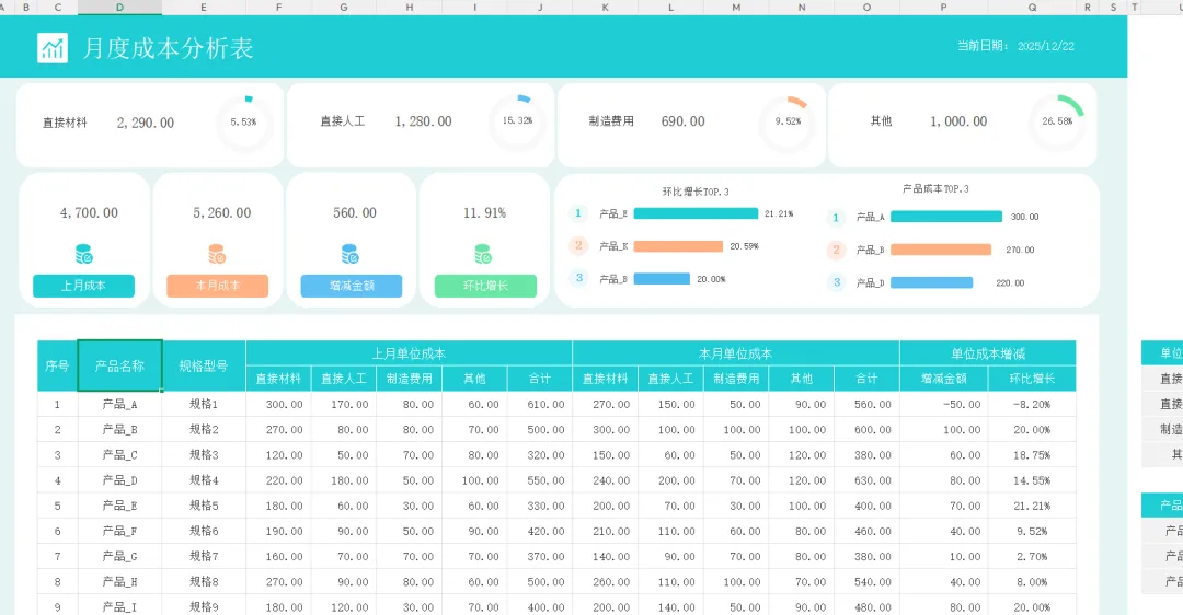 月财务分析报表模板,带公式,一键套用,自动生成可视化财务分析报表图形