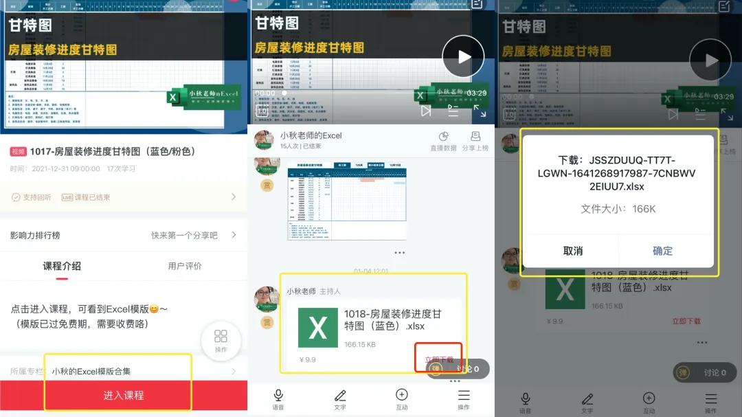 进入「模版合集」选择感兴趣的内容,点击「进入课程」--在上课页可看到Excel模版点击「立即下载」即可
