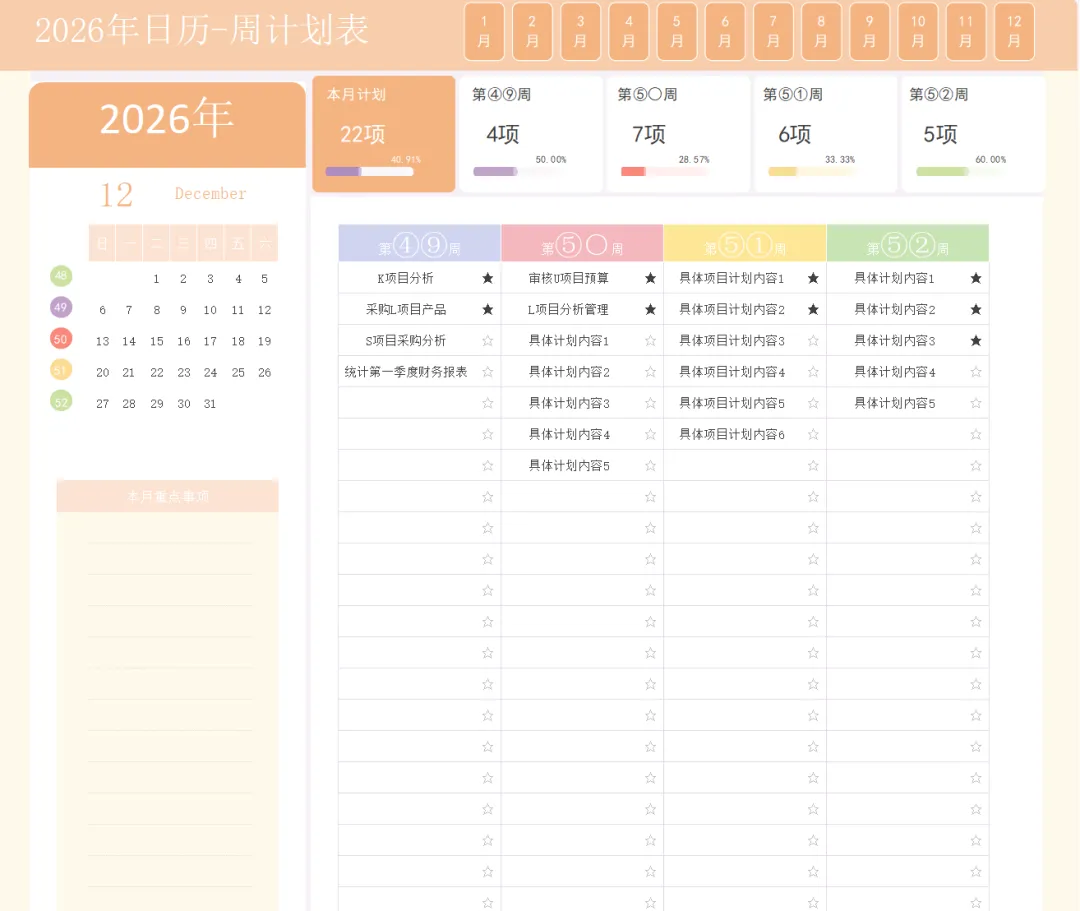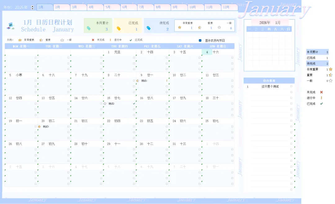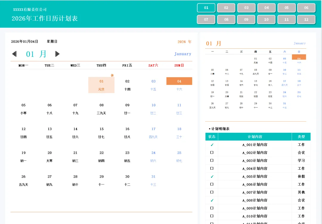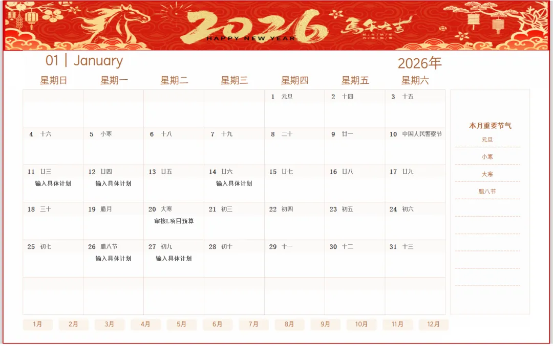 《2026马年高清日历+工作计划表模板》excel空白电子版,可编辑