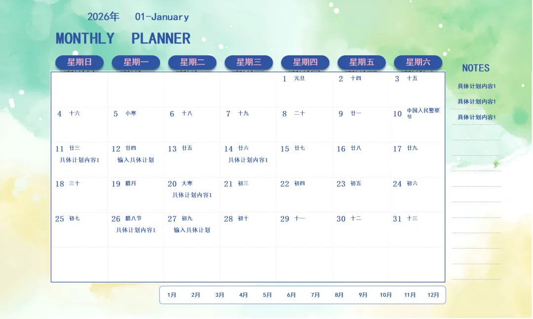 《2026马年高清日历+工作计划表模板》excel空白电子版,可编辑,可免费下载打印