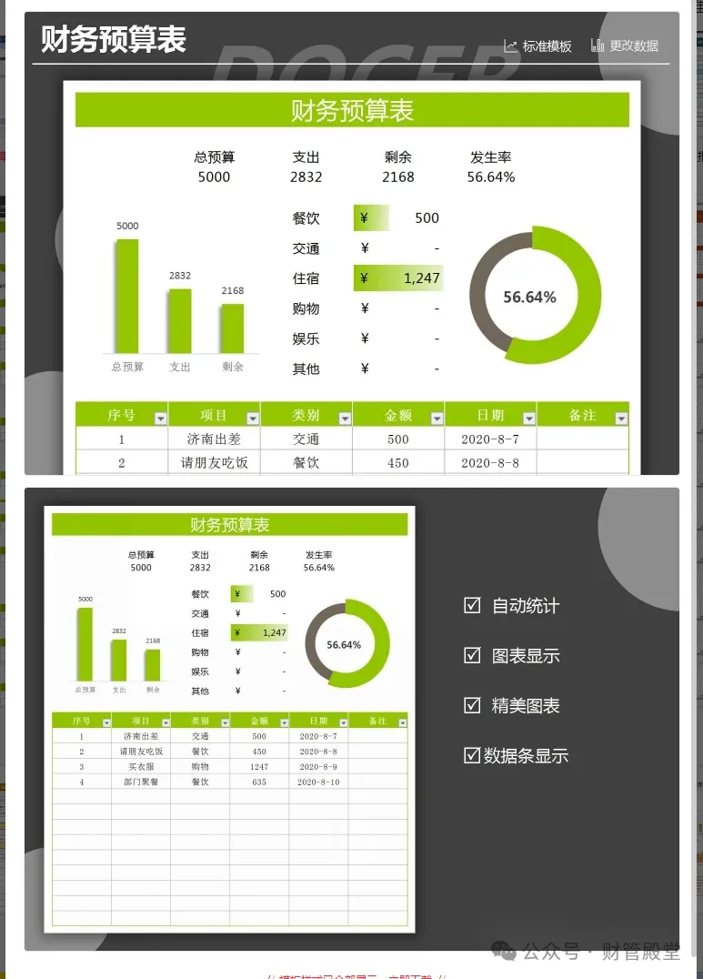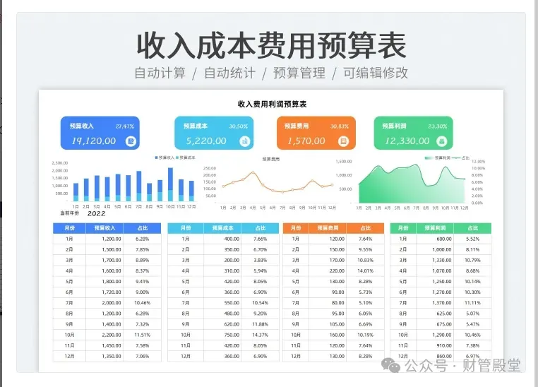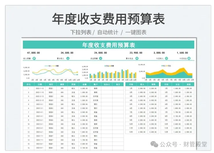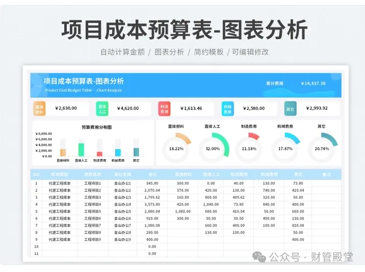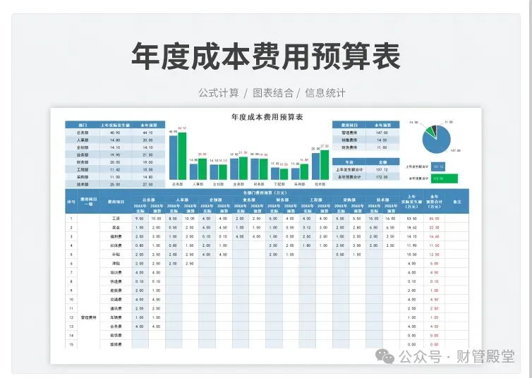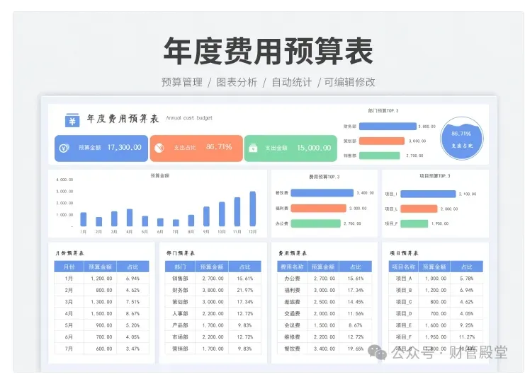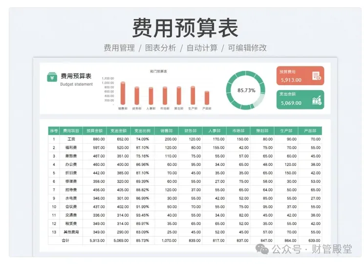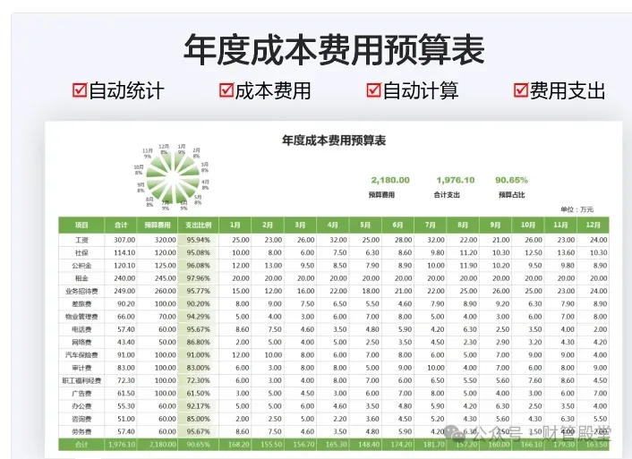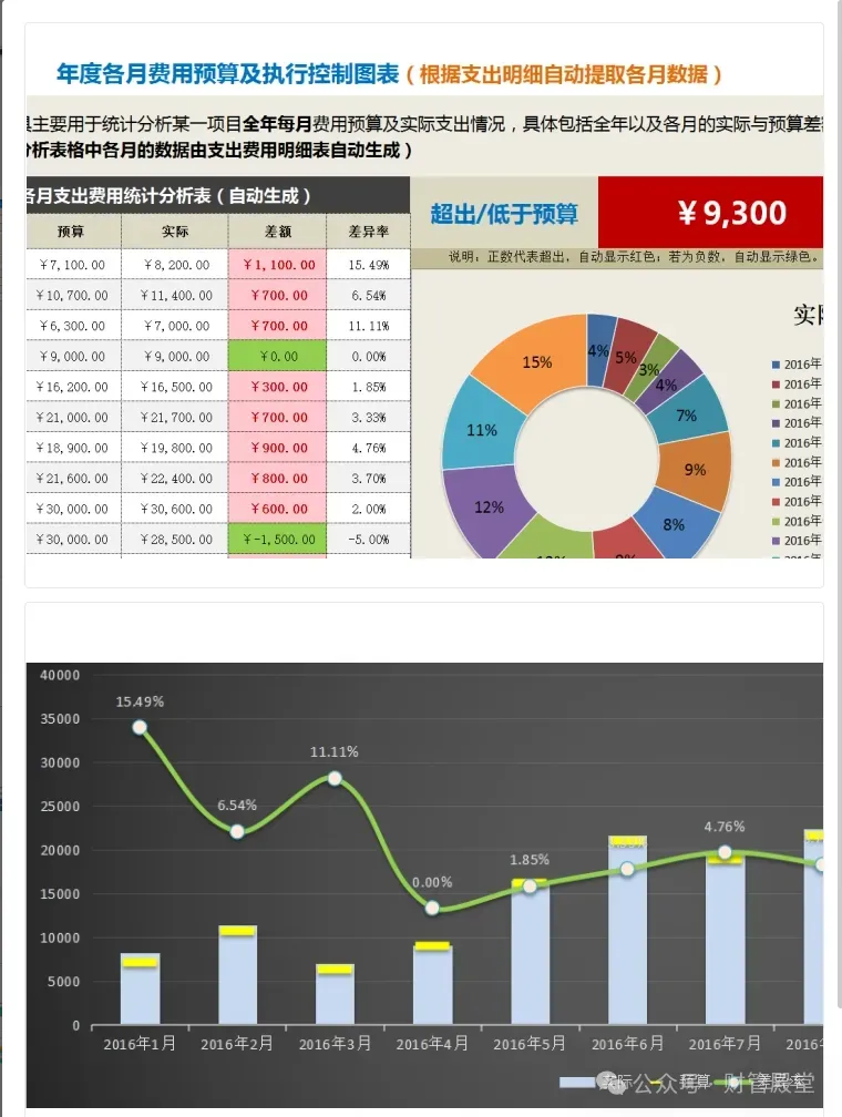 财务预算表格模板:费用预算自动统计、图表分析、可编辑修改!财务预算表格编制涉及到的函数公式设置,难为不少财务人员,今天小编借此机会在此跟各位财务人员带来了现成的费用预算自动统计表格模板,自带函数公式,套用后,费用预算自动统计、自动生成图表分析!费用预算情况一目了然。下面是详细的财务预算表编制界面展示,需要参考备考的财务人员可以看看。
