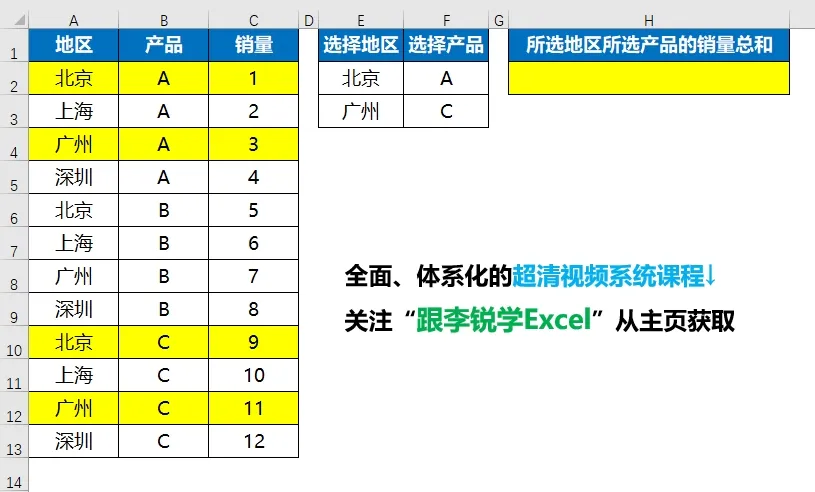 从下面的示意图动图演示中可以看到,当E列和F列选择地区和产品时,公式结果会自动计算出所选地区、所选产品的销量总和。