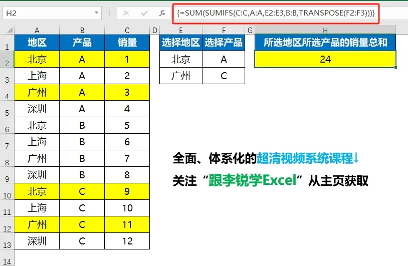 最后用SUM函数对多个求和结果汇总,就是所选地区所选产品的销量总和。