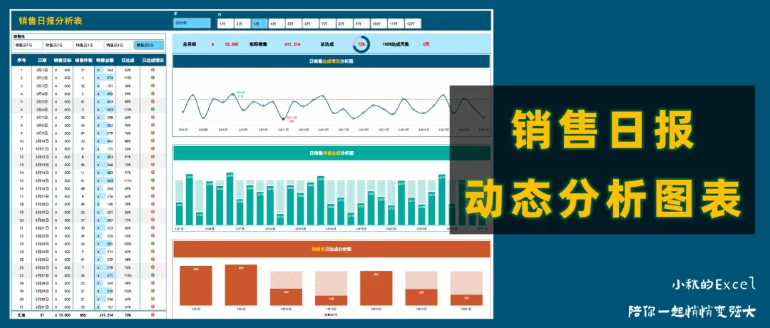 分析图表包含:总达成进度圆环图、日销售达成折线图、日销售金额柱形图、各销售员每日销售分析图等,便于时刻分析每日销售进度