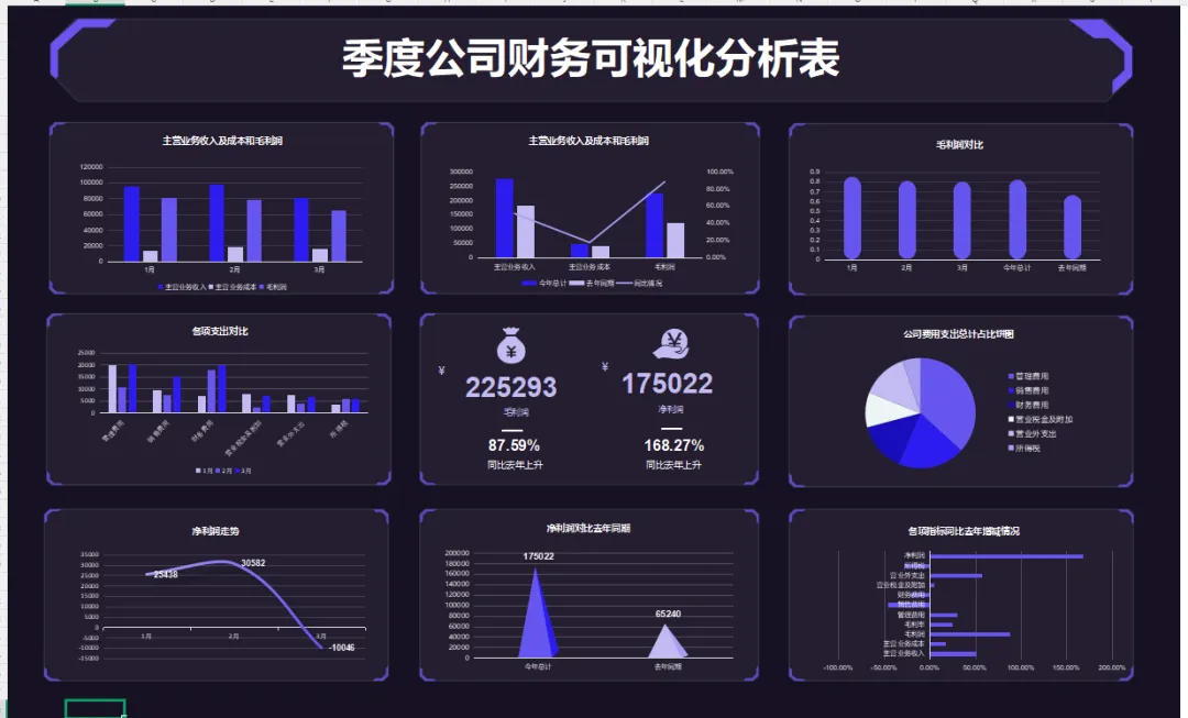 财务报表表格模板:季度财务分析表模板,带公式,一键套用自动生成可视化财务报表分析图形
